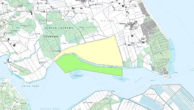 Ved højvande er det tydeligt at se digets placering og afgrænsning af fjordens rækkevidde.