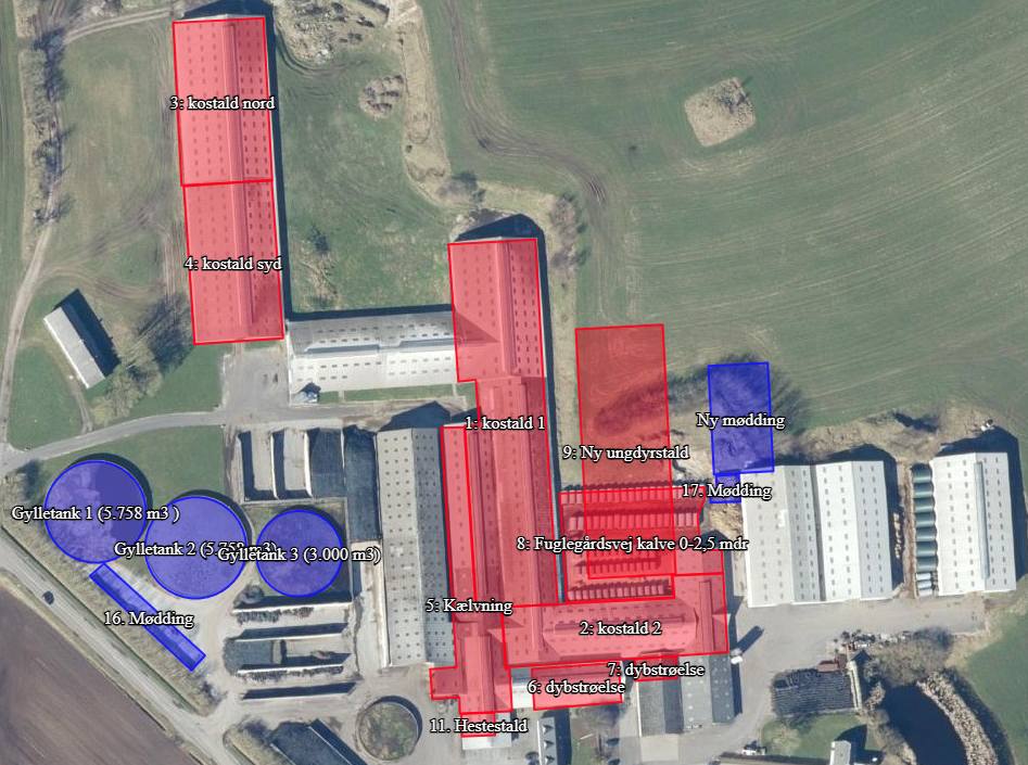 Derudover opstilles der fodersiloer nord og syd for stald 9 og nye mælketanke opstilles ved den store malkestald, samt lovliggørelse af fodersiloer opstillet øst for kornlade. Der etableres en ny møddingsplads nord for maskinhus med optil tre meter høje sider. Øvrige arealer med fast husdyrgødning ændres til køreareal (17. mødding) og ensilageplads 4 (16. mødding).