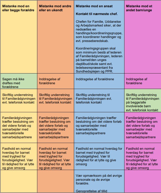 Beredskabsplanen indeholder handlevejledninger i tilfælde af mistanke eller viden om, at børn og unge har været udsat for overgreb – herunder både seksuelle overgreb, og fysisk eller psykisk vold.
