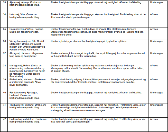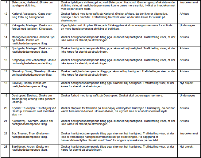 Mariagerfjord Kommune har modtaget 42 nye henvendelser i 2024. For hver henvendelse er angivet, hvordan ønskets status er i Trafiksikkerhedsplanen. For henvendelserne er der udarbejdet en af følgende indstillinger: