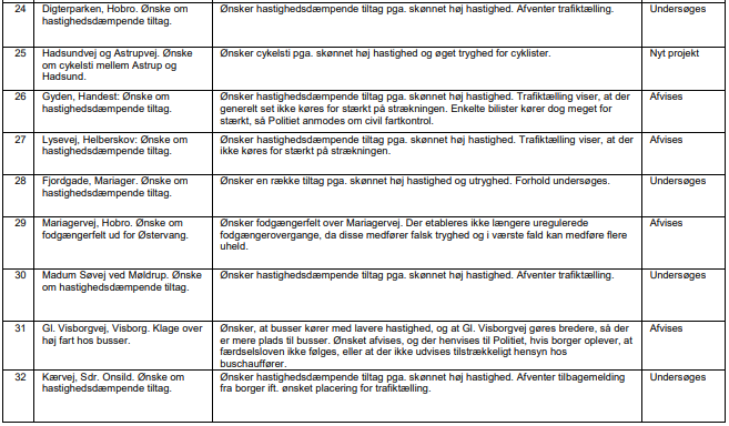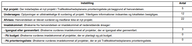 Som et led i opdateringen af Trafiksikkerhedsplanen er der foretaget en samlet gennemgang af de borgerhenvendelser, der er kommet til Trafik og Anlæg i løbet af 2024, og som Trafik og Anlæg har fundet relevante for Trafiksikkerhedsplanen. Hver henvendelse er vurderet i forhold til den aktuelle lokalitets status i Trafiksikkerhedsplanen, og om henvendelsen giver anledning til udpegning af et nyt projekt, ændring af et projekts prioritering eller anden opfølgning. Desuden er de registrerede trafikuheld på lokaliteterne gennemgået.
