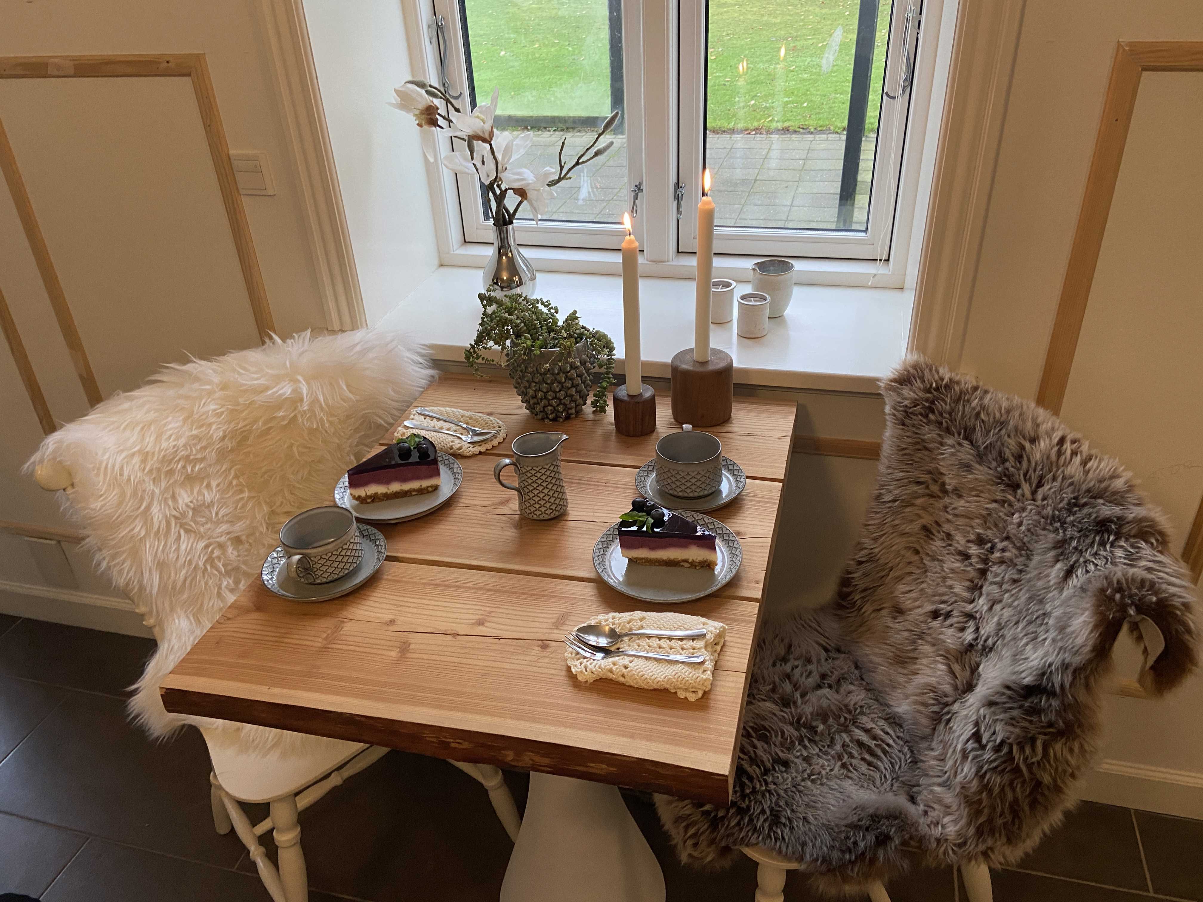 Indretningen har vi selv skabt gennem upcycling af træ, stof og materialer fra genbrugspladsen. Caféen bruges også til særlige lejligheder for medarbejdere og borgere – et sted, hvor vi fejrer fællesskabet.