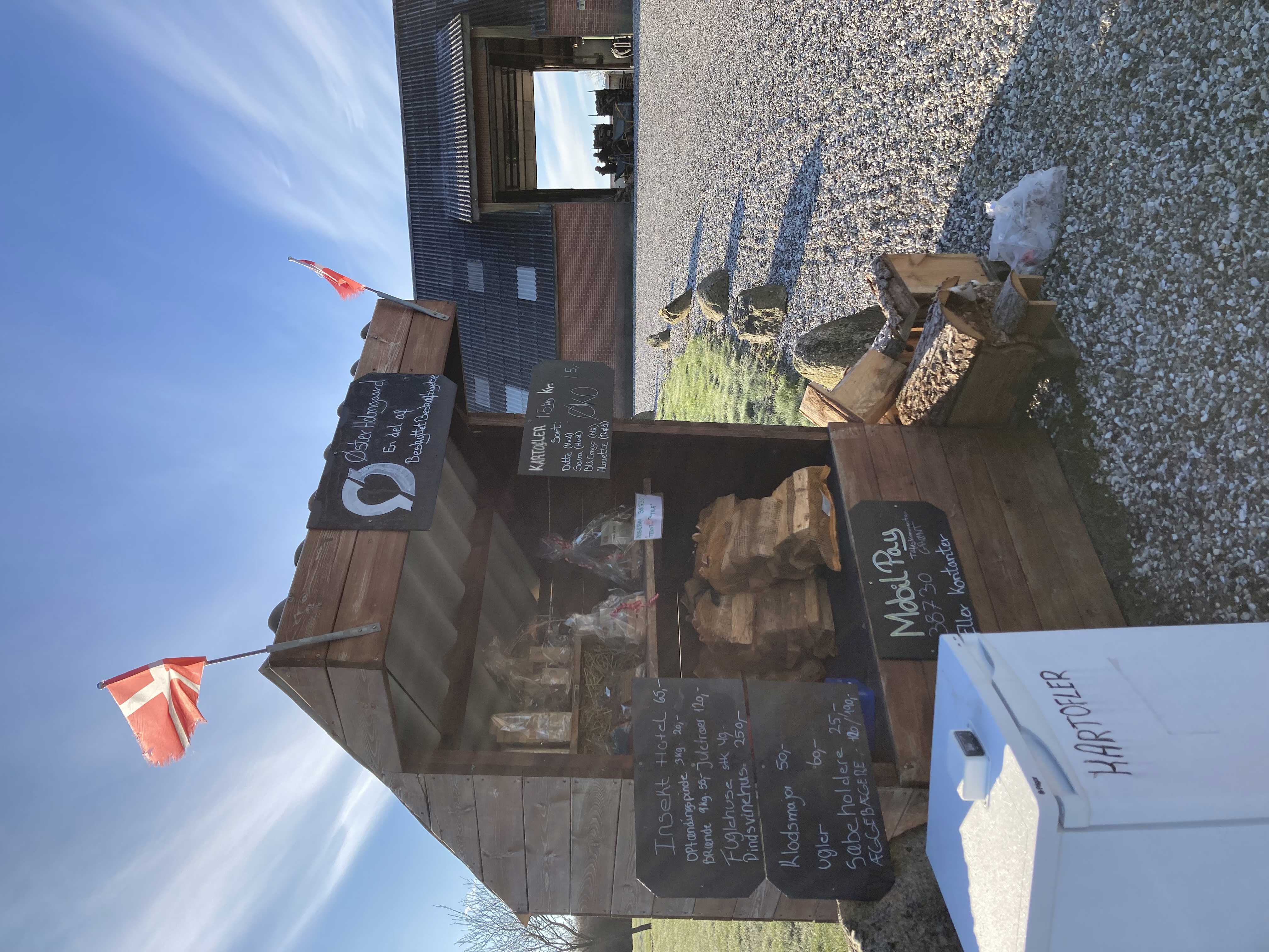 Fra vores vejbod kan du købe grøntsager, brænde, optændingspinde og keramik – alt, hvad vi dyrker og arbejder med på vores værksteder.